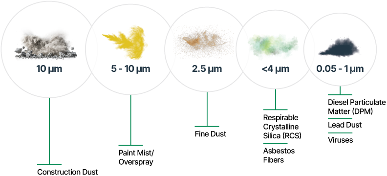 Our advanced filters are engineered to deliver high-efficiency performance across a wide range of particle sizes—from the smallest diesel particulate matter (DPM) and combustion particles to larger contaminants such as silica dust and asbestos fibers.