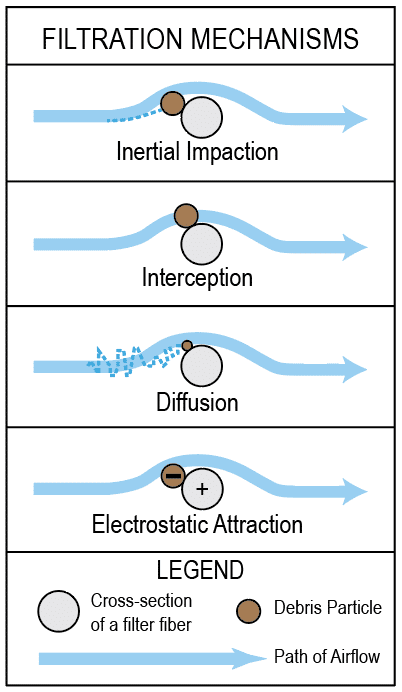 4. Electrostatic attraction – Occurs when an electrostatic charge on the filter fibers are present.
