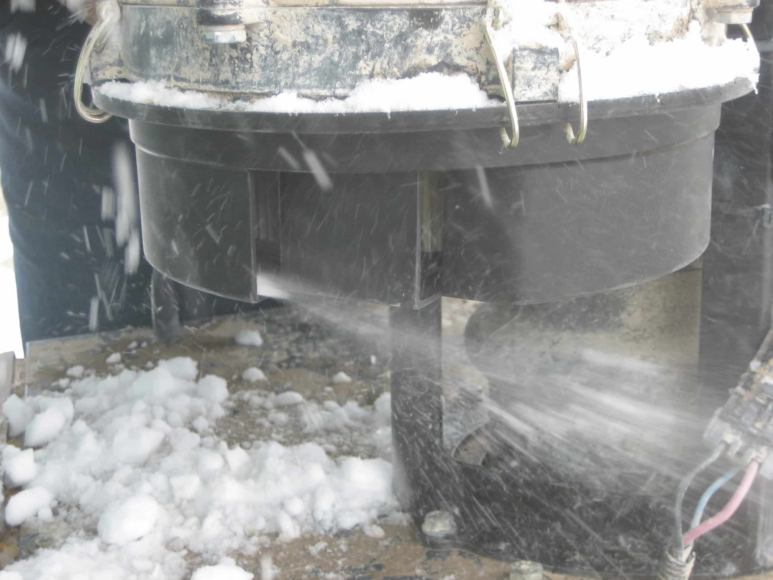 Air is drawn in from the underside of the dome, eliminating much of the snow or ice from entering at all. The material that does enter the dome is whirled by the rotors into stratified bands along the inside walls, which prevents the formation of clumps inside the precleaner. The bands of snow are whipped around to exit along the full length of the large ejection slot, preventing clogs. The clean air is directed in a 180° U-turn to go down the air inlet, which leaves behind any snow and ice remaining in the airflow.